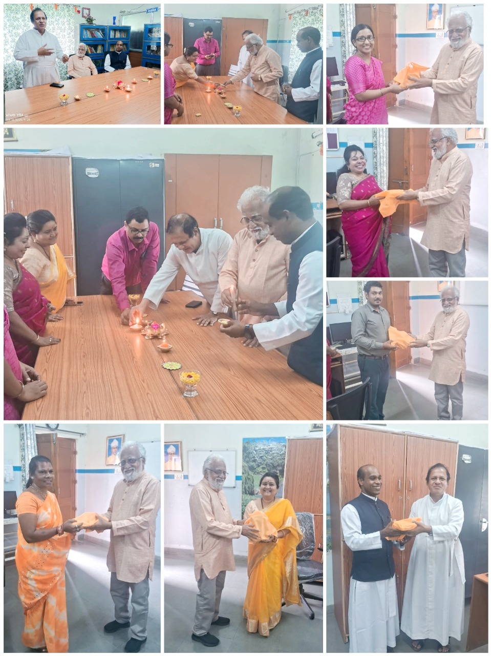 The campus was adorned with these intricate rangolis, symbolizing the welcoming of prosperity and positivity. Earthen diyas were carefully placed on the rangolis and in various workplaces around the college, illuminating the campus with a warm, traditional glow. Father Principal personally lit the diyas, which added to the sacred atmosphere of the celebration.