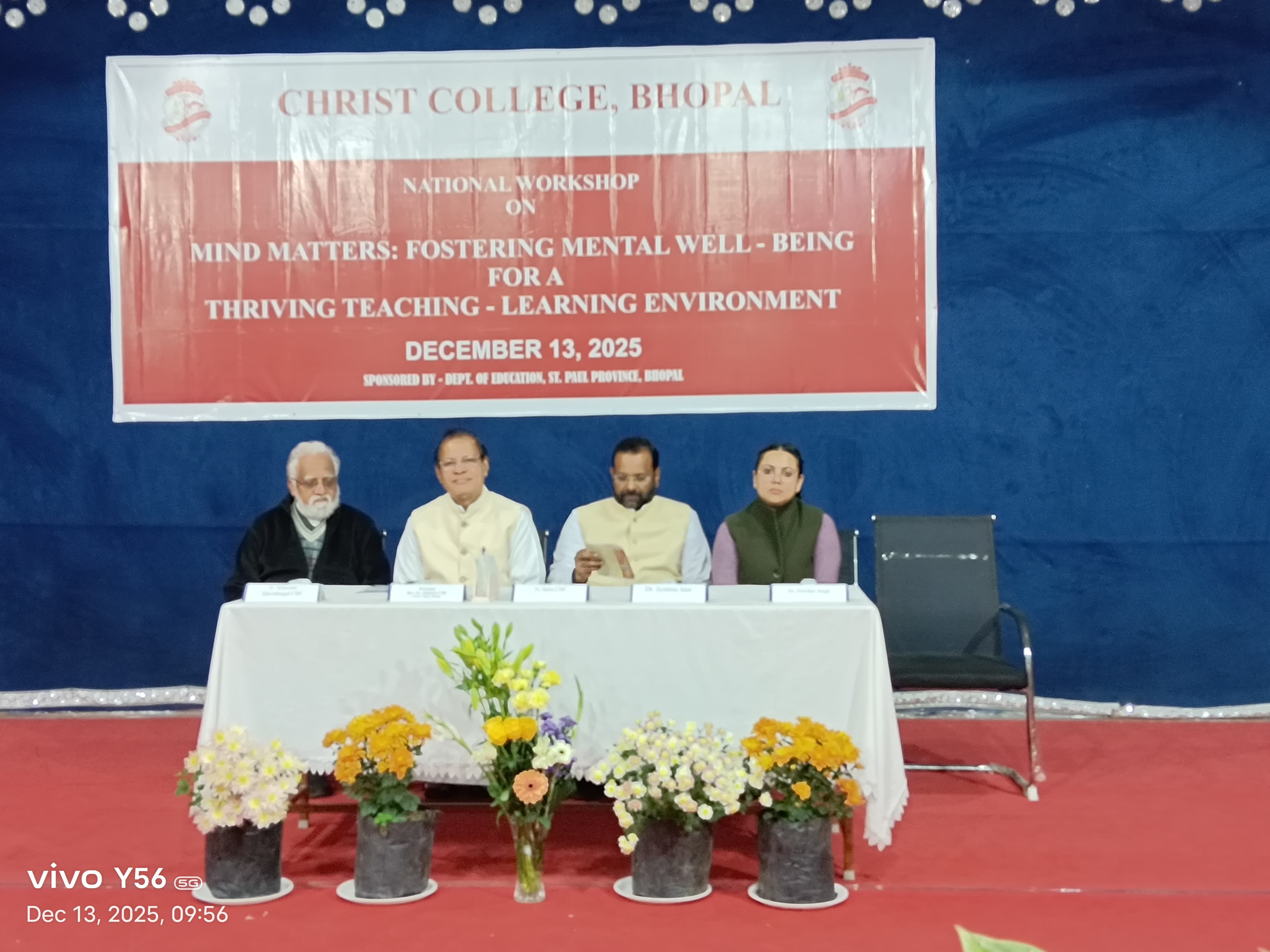 Christ College, Bhopal successfully organized a one-day National Workshop titled “Mind Matters: Fostering Mental Well-being for a Thriving Teaching–Learning Environment” on 13 December 2025. The workshop was convened by Dr. Diwakar Singh, Associate Professor, Christ College, Bhopal, and was generously sponsored by the Department of Education, St. Paul Province, Bhopal.